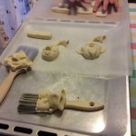 Valami finomabbat kerestem, kicsit a porcelán, de legalább az agyag finomságára hajazót. Olyat, amivel könnyen tudok dolgozni. A legjobbnak a fehérlisztes, finomsós, olajos recept tűnt. Ebből dolgoztam este. Teszteltem az összedolgozhatóságot, ragaszthatóságot, most pedig a szárítás van folyamatban.